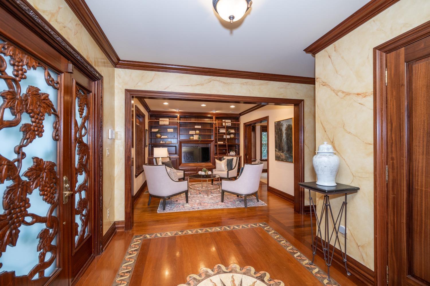 Large L-shaped lot connects with Berry Ave. Must see inside! Incredible detail from doors, moldings, and millwork, to hardwood flooring with beautiful inlay designs, marble, onyx, custom wrought iron. Top-to-bottom incredible attention to every detail. Flexible floorplan with 2 kitchens, 2 dining rms. Incredible wine room. Updated electric, zoned HVAC, generator. 4+ car garage. Owner detailed description available. Superb multi-generational home. Square footage is 4500+.